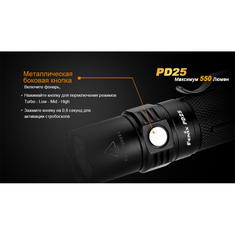 Коли Fenix PD25 включений, короткі кліки по бічній кнопці допоможуть вибрати потрібний режим яскравості в порядку Turbo-Low-Mid-High. Режим Strobe вибирається більш тривалим натисканням — 0,8 с.