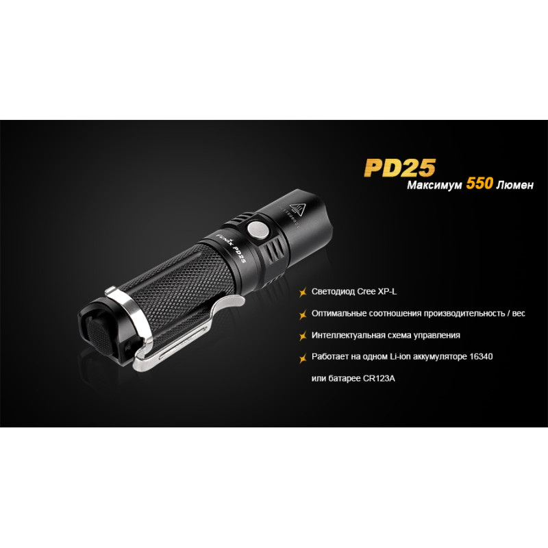 Інструкції по використанню: Fenix PD25 розрахований на роботу з компактними елементами живлення двох типів: CR123A батарейки (літієві), 16340 акумулятори (Li-ion). Батарейний відсік зроблений під один елемент живлення і має маркування, що враховує полярності батареї.