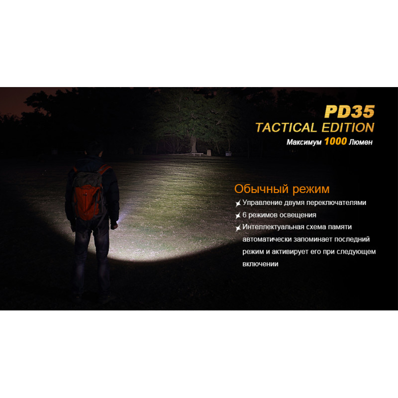 В оптичній системі ліхтарі Fenix PD35 TAC використовується светодиод Cree XP-L (V5), який у нинішній час вважається самим сучасним. Він на 251% продуктивніше, ніж світлодіод попереднього покоління, але комерційно доступний для широкого кола покупців. Цей світлодіод дає можливість ліхтаря давати до 1000 люмен яскравості при дистанції освітлення до 200 м. Модель Fenix PD35 TAC працює в двох різних режимах: тактичному і звичайному, кожен з яких надає доступ до декількох варіантів освітлення.