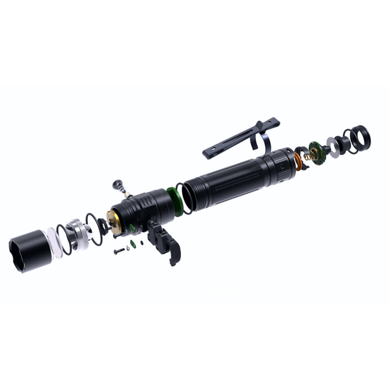 Управляется этот фонарь по стандартному принципу 2 кнопками: тактической и функциональной. Для его работы потребуется 1 аккумулятор формата 21700. В комплекте уже есть фирменный элемент питания емкостью 5000 мАч. Он рассчитан по меньшей мере на 500 циклов перезарядки и может заряжаться через кабель USB type-C непосредственно внутри батарейного отсека. А чтобы пользователь всегда был в курсе актуального состояния аккумулятора, в фонарь встроен индикатор. Он включается автоматически на 3 секунды при каждом включении фонаря и работает исключительно с фирменным аккумулятором. Если индикатор светится равномерным зеленым светом, значит аккумулятор заряжен на 75%-100%. Если зеленый свет мигает, значит осталось 50%-75% заряда. Когда индикатор равномерно светится красным, элемент питания заряжен на 25%-50%. Если красный свет мигает, заряда осталось менее 25%.