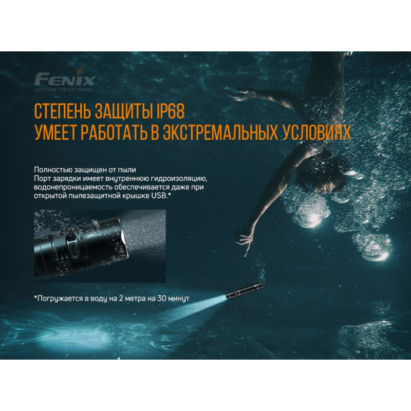 Большим преимуществом ручного фонаря Fenix PD36R является высокий уровень его защиты от факторов внешнего воздействия. Он заключен в алюминиевый корпус, хорошо оберегающий диод и другие механизмы от ударов или вибрации. А влагоизоляция всех стыков деталей по стандарту IP-68 делает этот фонарь полностью водонепроницаемым и способным работать под водою в течение 30 минут.