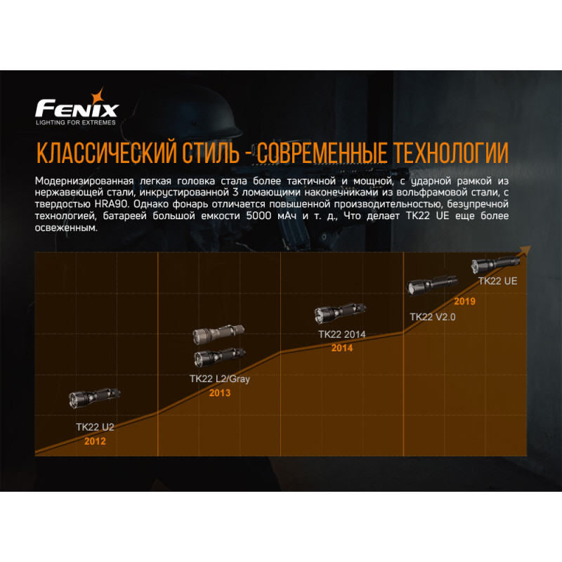 Новинка Fenix TK22UE – це прилад для освітлення з високою продуктивністю. Позиціонується як класичний тактичний ліхтар. Модель в змозі похвалитися такою вражаючою яскравістю, як 1600 люмен. Крім того, дальність дії освітлення становить 405 метрів. Це чудовий варіант для полювання, може використовуватися в туристичній діяльності. Витримує суворі випробування і складні умови того місця, в якому ви можете опинитися.