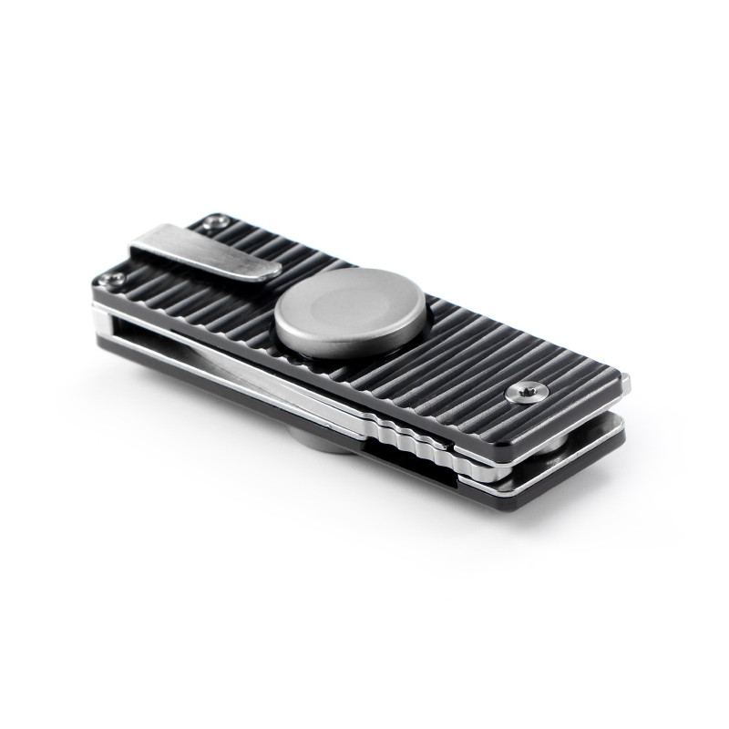 Рукоятка ножа теж виконана з металу. Для цього важливого елемента виробники вирішили використовувати алюмінієвий сплав стійкий до корозії. Поверхня накладок зроблена чорного кольору з поперечними жолобками, які роблять рукоятку не слизькою.