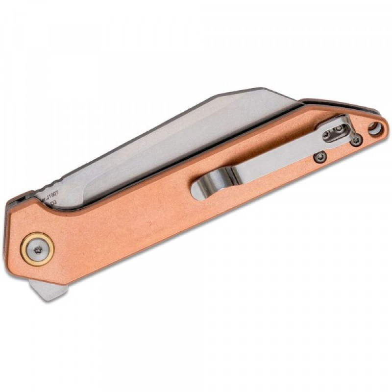 Модель має накладки з міді, що додає ножу виразності. Рукоять оснащена кліпсою з нержавіючої сталі, а також отвором для кріплення темляка.