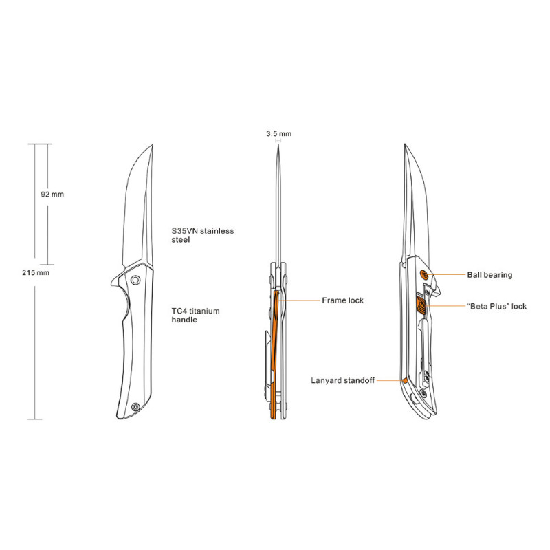 Вес 110 г Вид ножа кишеньковий, туристичний Гарантия 5 років Длина клинка 92 мм Марка стали S35VN Общая длина 215 мм Твердость клинка 58-60 HRC Тип замка Frame lock Тип заточки прямий Тип ножа складаний