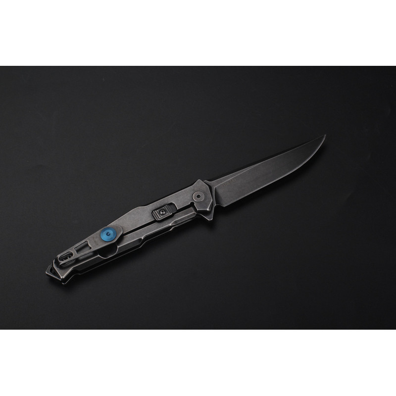 Так, клинок виготовлено з сплаву 14C28N — одного з кращих для кухонних ножів та інших, яким має частий контакт з водою. У нього висока опірність до будь-яких видів корозії, а разом з тим — твердість близько 58-60 HRC, що забезпечує хорошу стійкість заточування. Ріжуча кромка ножа зроблена по всій своїй довжині гладкою. А високу міцність клинку забезпечує і досить велика товщина — 3,1 мм. Крім того, що клинок зроблений чорним, він ще і матовий, що досягнуто шляхом шліфування Stone washed.