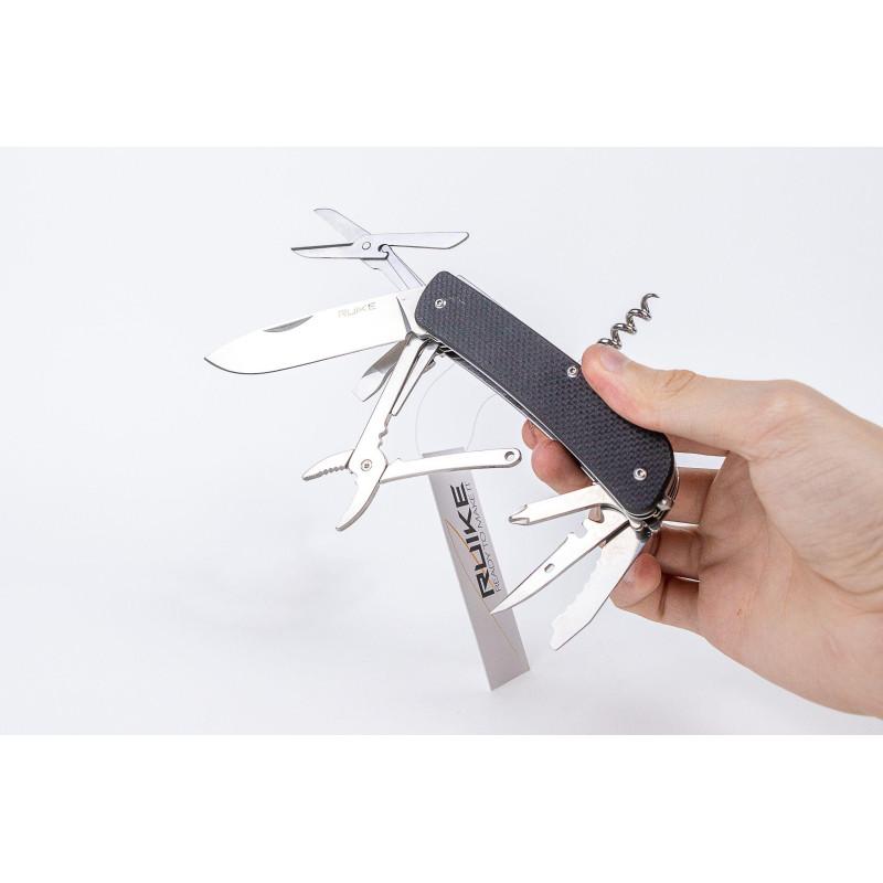 Крім ножа власник Ruike L41 може використовувати, коли це буде потрібно, пилку для дерева, стропоріз, маленьку і середню викрутки з прямим шліцом, спеціальний інструмент для зачистки від ізоляції проводів. Тут також є штопор і відкривачка для пляшок, що для відпочинку на природі буває не менш актуальним, ніж наявність інших інструментів. Ще пара додаткових інструментів розміщені на торці рукоятки ножа. Це стальний склобій і невелике кільце, яке можна використовувати для фіксації темляка.