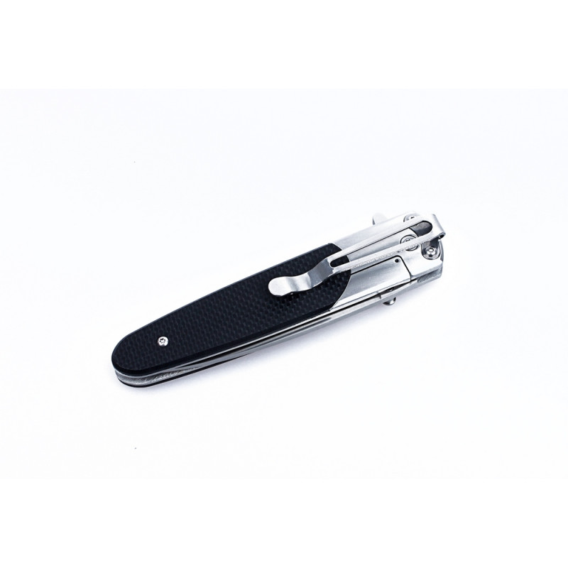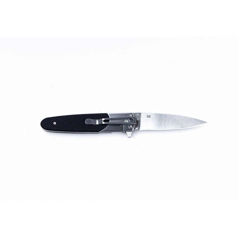 Форма рукоятки в моделі G743-1 дуже лаконічна. Знизу і зверху вона рівна, а зовнішній торець акуратно закруглений. Ближче до клинку частина рукоятки зроблена із сталі і відшліфована тим же методом, що і клинок. До цієї металевої частини кріпиться і кліпса, що служить додатковою мірою фіксації ножа, коли він повинен залишатися в зоні доступності під час поїздок власника ножа на природу.
