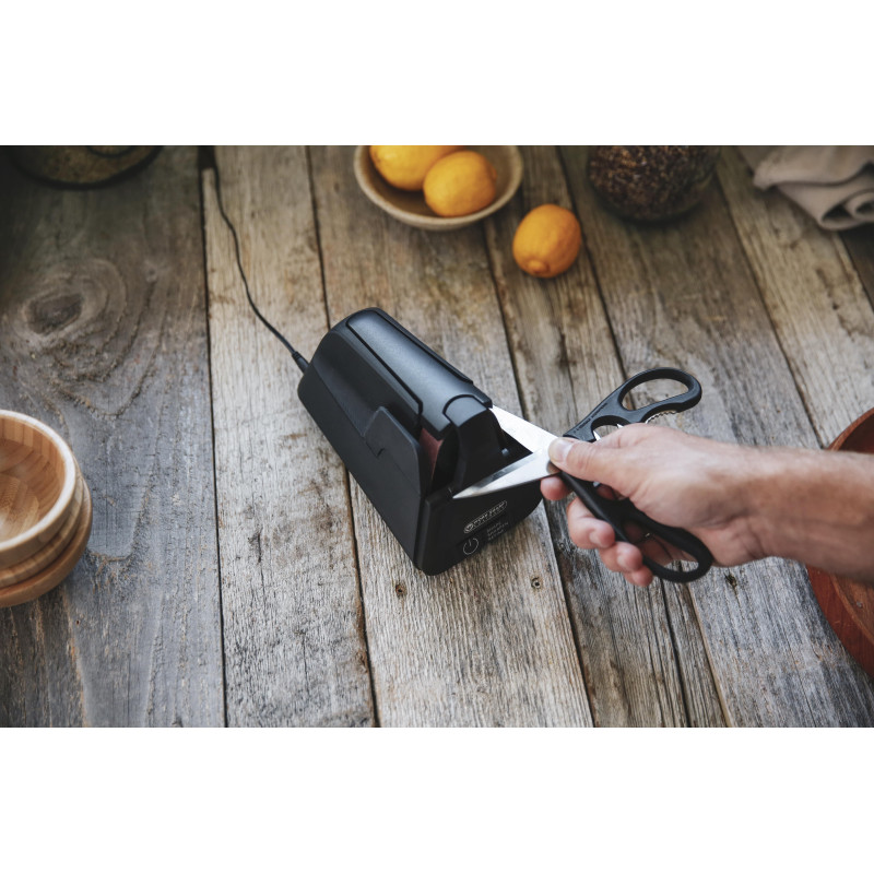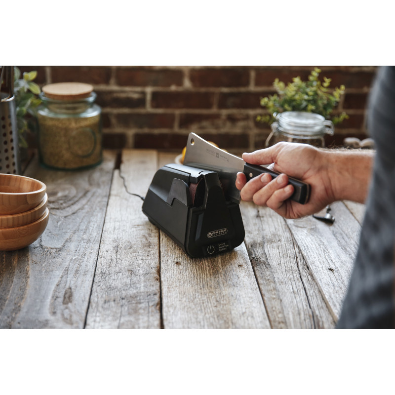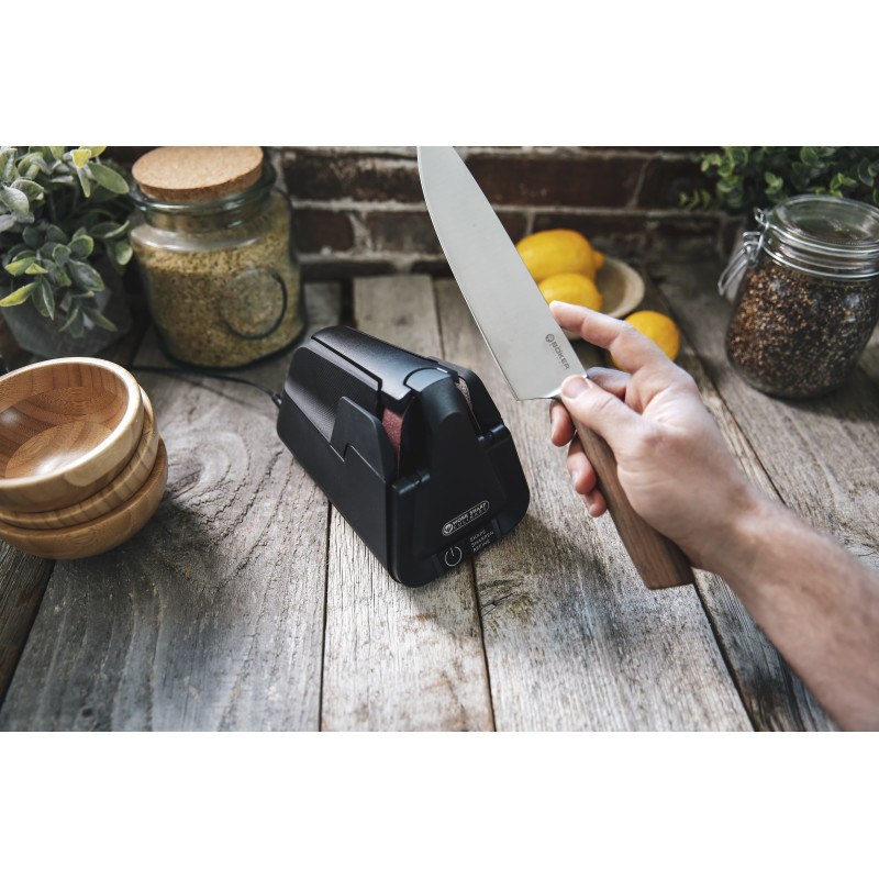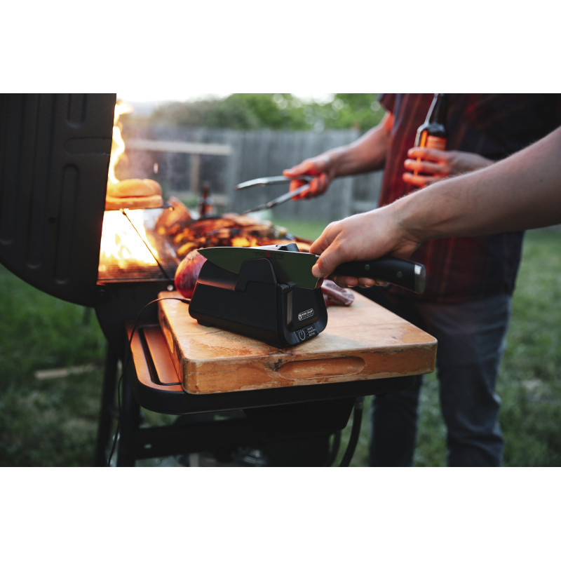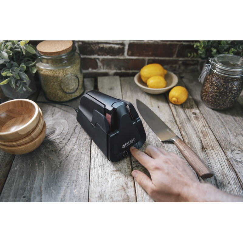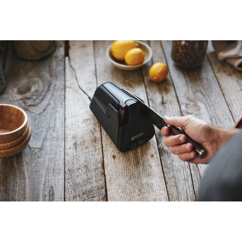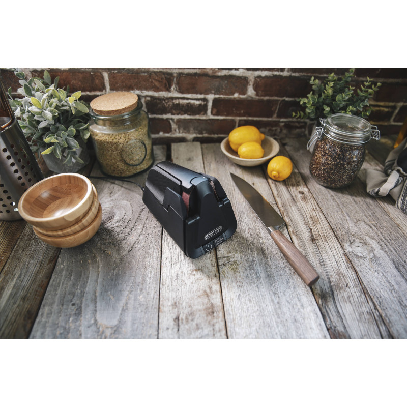 Нещодавно розроблена в гладкому чорному кольорі електрична точилка E4 буде точити ваші ножі так само, як і з застосуванням гнучких заточувальних ременів. Завдяки інноваційним функціям, які включають в себе: програмування одним дотиком, направляючі для заточування на 17° і можливість використовувати всі ножі і ножиці на вашій кухні.Просто увімкніть точило, і вперед! Створюйте постійну геометрію кромок при кожній обробці за допомогою направляючих заточування у 17°. Ви можете розширити можливості підвищення різкості за допомогою комплекту оновлення E5 (напрямні 15° і 20°, продаються окремо). Багатофункціональний дизайн та інноваційна технологія E5 додають простоту і зручність при заточуванні, зберігаючи ваші ножі гострими весь час.