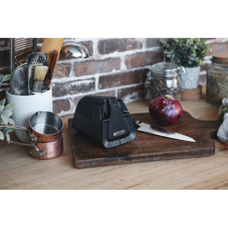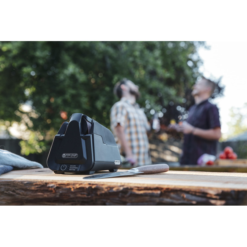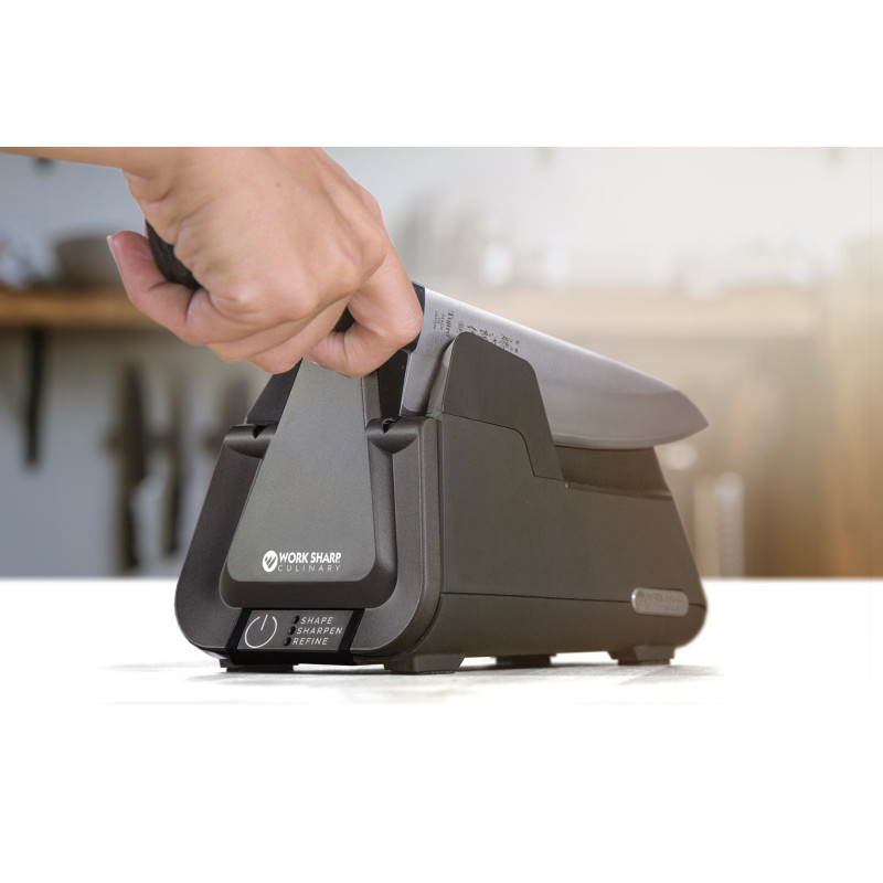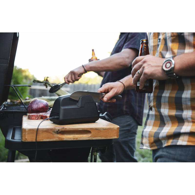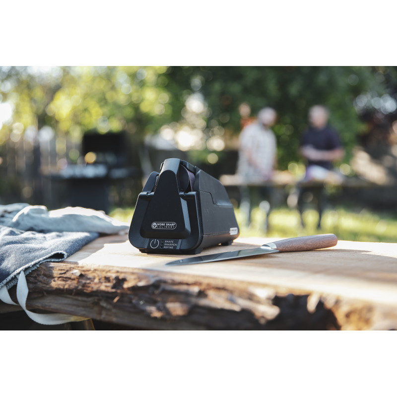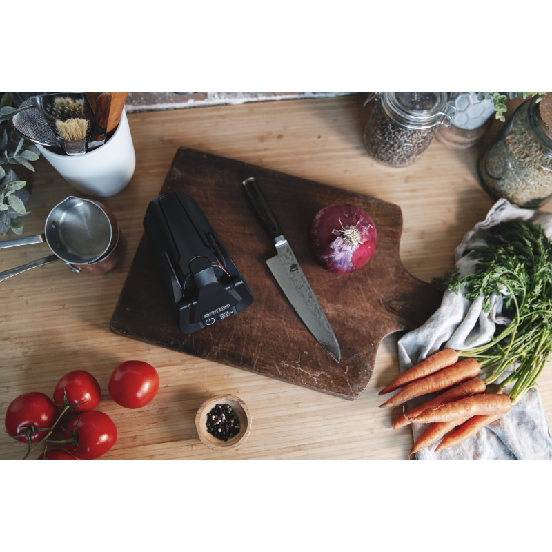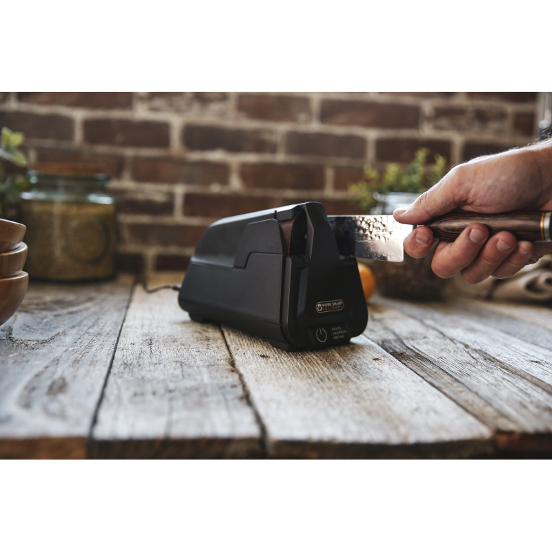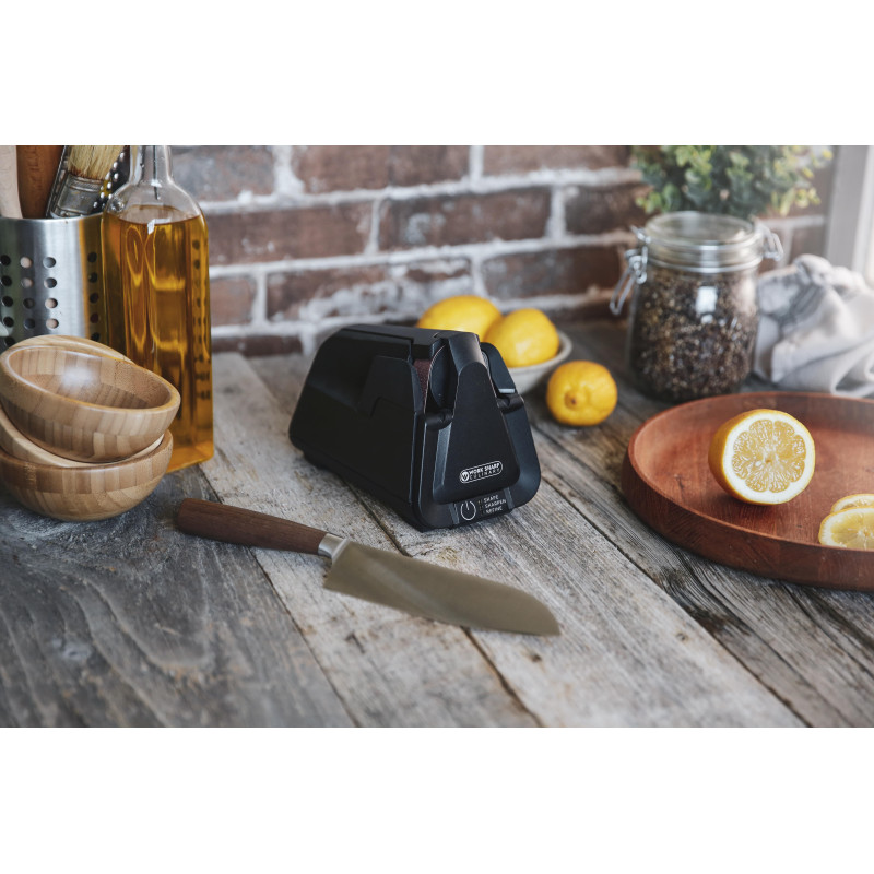 Нещодавно розроблена в гладкому чорному кольорі електрична точилка E4 буде точити ваші ножі так само, як і з застосуванням гнучких заточувальних ременів. Завдяки інноваційним функціям, які включають в себе: програмування одним дотиком, направляючі для заточування на 17° і можливість використовувати всі ножі і ножиці на вашій кухні.Просто увімкніть точило, і вперед! Створюйте постійну геометрію кромок при кожній обробці за допомогою направляючих заточування у 17°. Ви можете розширити можливості підвищення різкості за допомогою комплекту оновлення E5 (напрямні 15° і 20°, продаються окремо). Багатофункціональний дизайн та інноваційна технологія E5 додають простоту і зручність при заточуванні, зберігаючи ваші ножі гострими весь час.