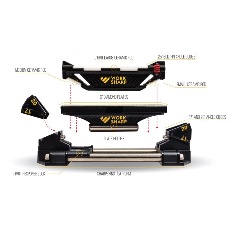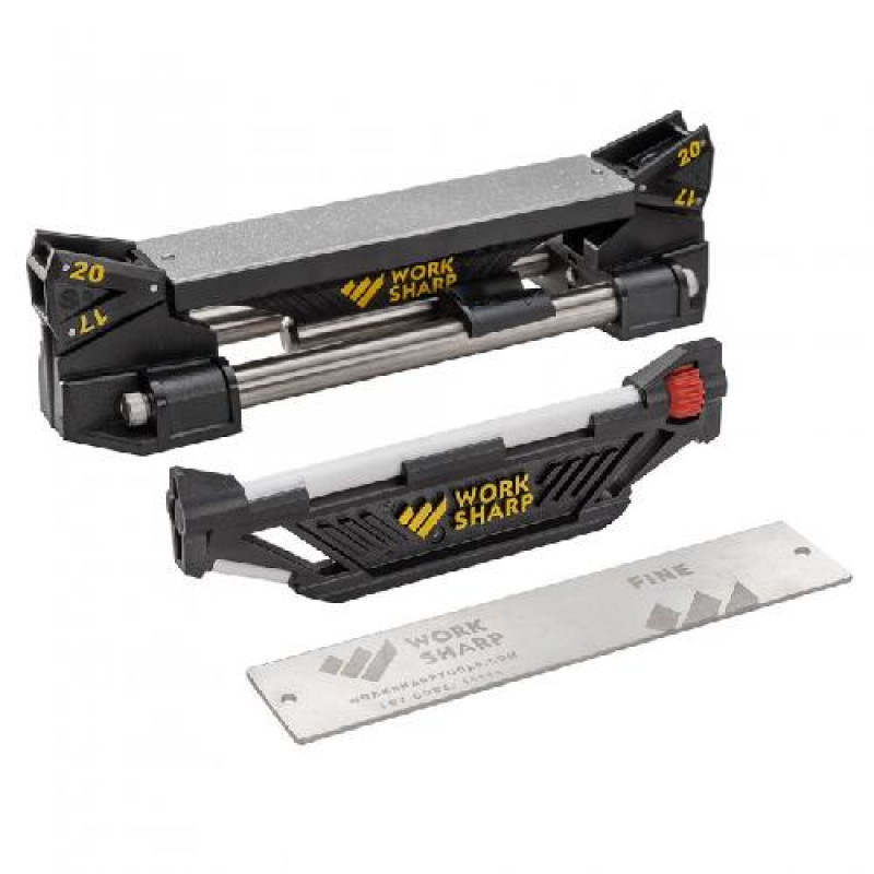 Guided Sharpening System - комплексне пристрій, розрахований на повний цикл заточення/доведення. Якщо використовувати додатковий набір Upgrade Kit з двох пластин з алмазним напиленням і пластину з приклеєною шкіряною стрічкою, то функціонал розширюється від переточування на інший кут до суперфиниша на пасті.