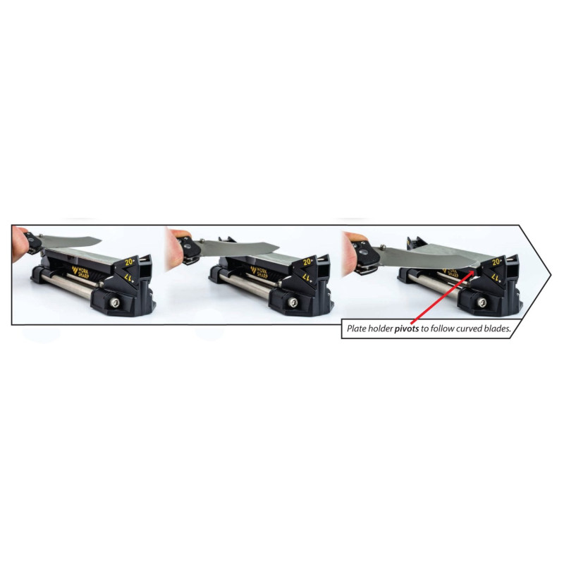Платформа з алмазної пластиною має два режими. Перший - жорстка фіксація (за допомогою пластикової каретки, яка їздить по сталевих напрямних станини), при якому ми отримуємо стандартну підставку під абразивні пластини, і другий - при якій платформа із закріпленою пластиною може вільно відхиляться на певний (не великий) кут уздовж центральної осі пластини яку можна позначити двома шпеньками на який кріпиться пластина до платформи. За рахунок цього "хитання" знімання металу йде рівномірно по всі поверхні ріжучої кромки без необхідності зміни кута нахилу леза до поверхні абразиву. Процес заточування завдяки своїй простоті, приносить радість і задоволення.