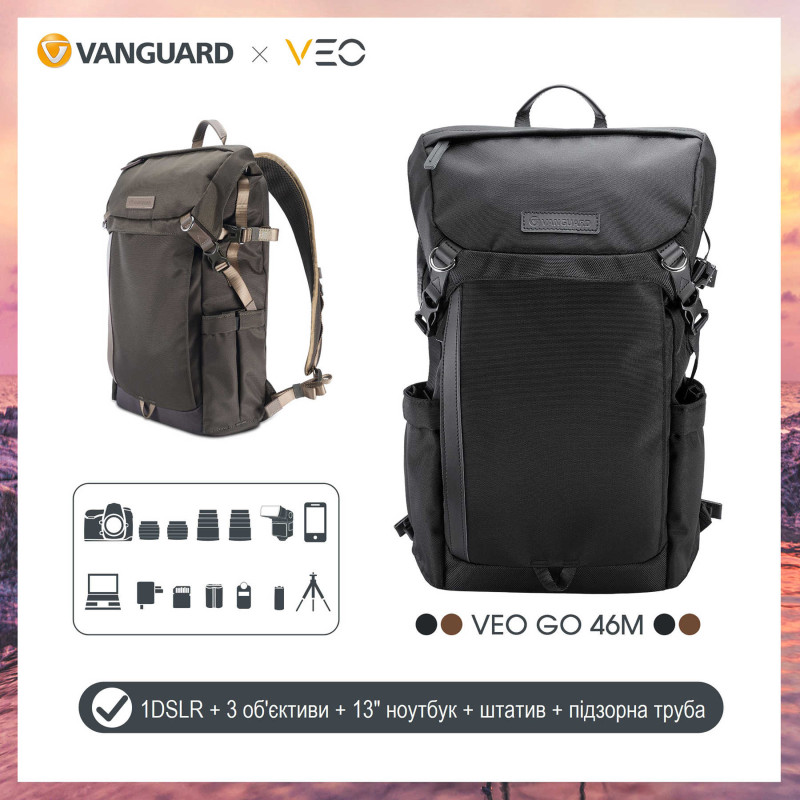Рюкзак Vanguard VEO GO 46M с накидкой от дождя предназначен прежде всего для DSLR камер, а также CSC камер со сменной оптикой, и создает свежий образ городского путешественника. Его стильный дизайн не кричит «Я - рюкзак для фотоаппарата». Напротив, рюкзак очень аккуратный, имеет плоский формат и отлично прилегает к спине, его внутренняя модульная система позволяет извлечь все внутренние разделители и использовать VEO GO 46M в качестве городского рюкзака, а при необходимости разместить в нем подзорную трубу, бинокль, квадрокоптер и другие приборы, требующие надежной защиты.
