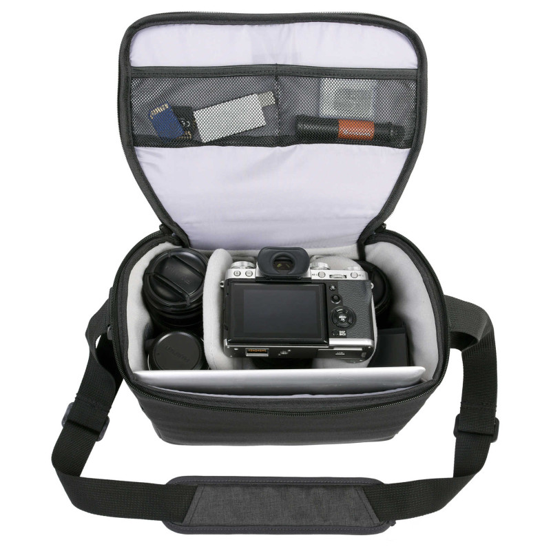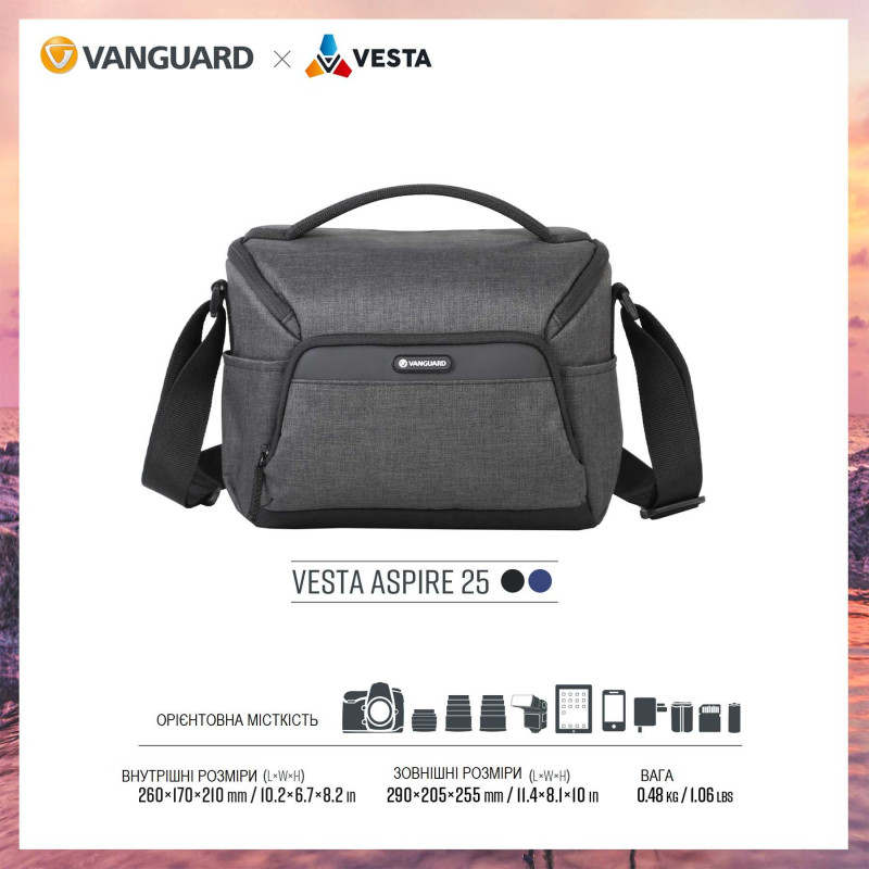 Когда Вы готовы перейти от снимков в смартфоне к настоящей фотографии, сумки Vanguard Vesta Aspire - это именно то что Вам необходимо, конечно же, наряду с самой фотокамерой. Vesta Aspire 25 воплощает концепцию "минимум для максимума". Внешние размеры и компоновка этой сумки настолько продуманны, что она без проблем способна вместить зеркальную камеру с четырьмя объективами, вспышкой, зарядным устройством и другими необходимыми аксессуарами. Фактически для фотосъемки будет необходим только штатив, все остальное вмещает Vesta Aspire 25. Разработанная для самых популярных комплектов камер, Vesta Aspire обеспечивает отличную защиту от ударов и влаги, а также функциональность наряду с интуитивно понятной компоновкой карманов и отделений.