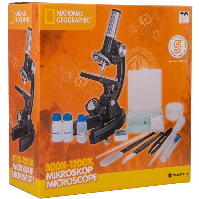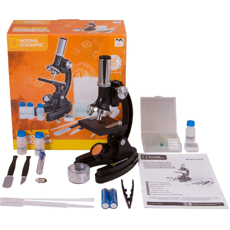 Детский микроскоп National Geographic 300x-1200x рекомендован для детей и подростков в возрасте от 6 лет. Микроскоп укомплектован широким перечнем аксессуаров, готовых слайдов для просмотра, оснащен револьверной головкой с тремя объективами, дающими в комплексе с окуляром увеличение 300х, 600х и 1200х. Освещение образцов осуществляется как дневным светом, так и лампой накаливания. Питание осуществляется от сменных батареек, идущих в комплекте.