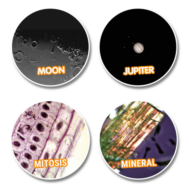 Этот базовый обучающий набор оснащен всеми необходимыми аксессуарами и приборами, имеющими ту же принципиальную конструкцию, что и профессиональные микроскопы и телескопы. Набор откроет вашему ребенку дверь в увлекательный мир астрономии и микроскопии. Телескоп с 30-ти кратным увеличением позволит заглянуть в космос, а микроскоп с максимальным увеличением в 640 крат позволит ознакомиться с окружающим нас, но доселе невидимым микромиром. Отличительной особенностью данного набора является наличие адаптер для камеры смартфона. С помощью адаптера для смартфона, идущего в комплекте, легко фотографировать объекты наблюдений и микроскопа и телескопа на камеру вашего смартфона.