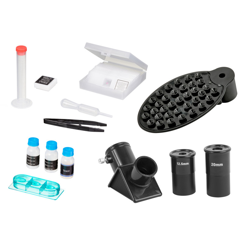 Помимо телескопа и микроскопа, набор включает в себя множество дополнительных аксессуаров, которые позволят без отлагательств приступить к наблюдениям.
