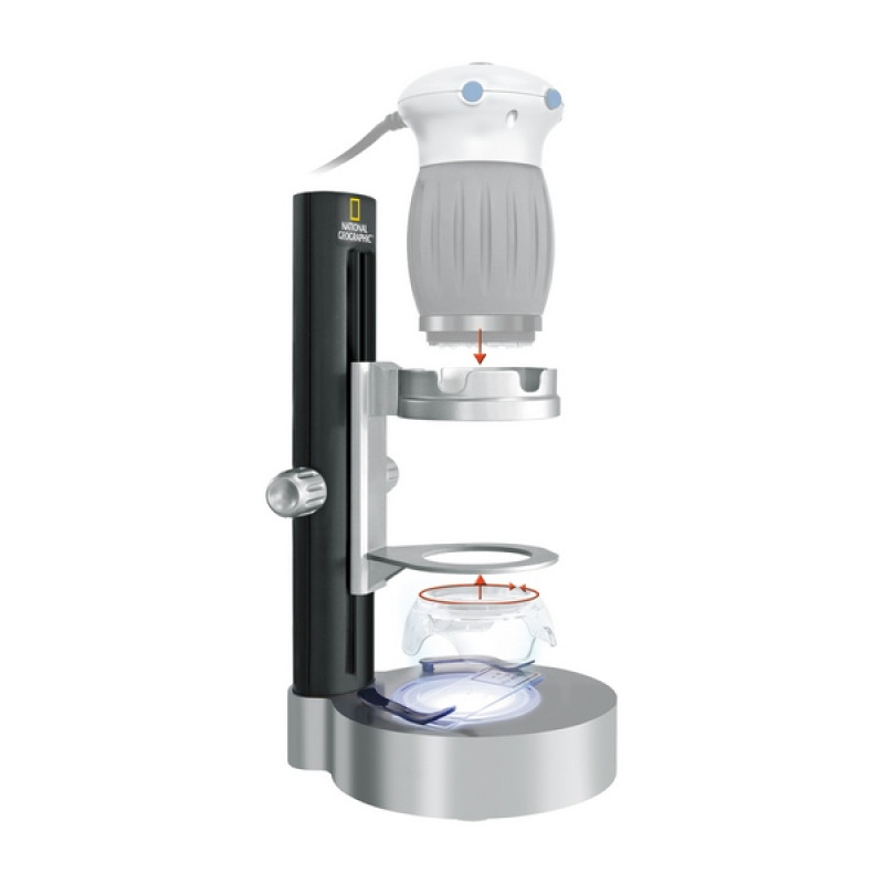 Детский микроскоп National Geographic Universal 20x/200x при более детальном рассмотрении откроется как довольно функциональный и интересный прибор, который можно использовать не только, как микроскоп для наблюдения биологических микро и макрообразцов, но и в качестве веб-камеры. Микроскоп позволяет снимать и сохранять фото и видео с разрешением 1,3 Мп. Наблюдения можно проводить, закрепив микроскоп стационарно, или наводя рукой на интересующую часть объекта.
