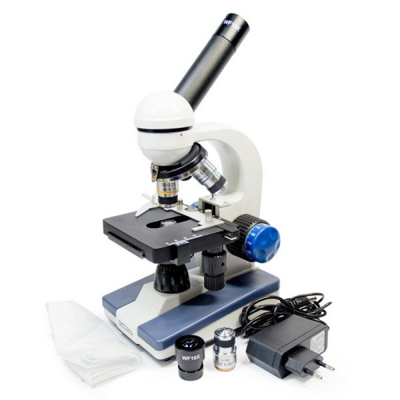 Комбинация двух широкопольных окуляров и четырех объективов, обеспечивает увеличения в диапазоне от 40 до 1600 крат. Все оптические элементы (объективы, окуляры и конденсор) выполнены из стекла. Широкопольные окуляры имеют просветляющее покрытие и обеспечивают контрастное и равномерно четкое изображение по большей части поля зрения. Ахроматические объективы стандарта DIN рассчитаны на работу с покровным стеклом толщиной 0.17 мм. Подпружиненная конструкция сорокакратного и стократного объективов убережет от повреждений препарат и сами объективы при их взаимном максимальном сближении. Не смотря на то, что конденсор данной модели микроскопа не позволяет получить максимальное разрешение при использовании иммерсионного объектива 100х, все же наличие данного объектива значительно расширит возможности для наблюдения, особенно при использовании иммерсионной жидкости.