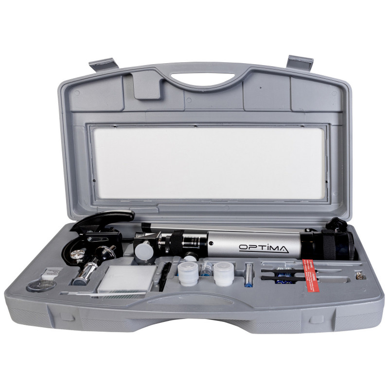 Подарочный набор Optima Universer - это не только телескоп и микроскоп, но и масса дополнительных полезных аксессуаров, которые создадут захватывающую игровую обстановку для ребенка. Вместе с тем обучающий набор приоткроет вашему ребенку дверь в увлекательный мир астрономии и микроскопии, и позволит показать то, что зачастую родителям сложно передать словами. Телескоп с 60-ти кратным увеличением позволит увидеть и мысленно отправиться в путешествие по лунным кратерам, а микроскоп с максимальным увеличением в 1200 крат легко увеличит изображение инфузории туфельки до размеров настоящей туфельки.