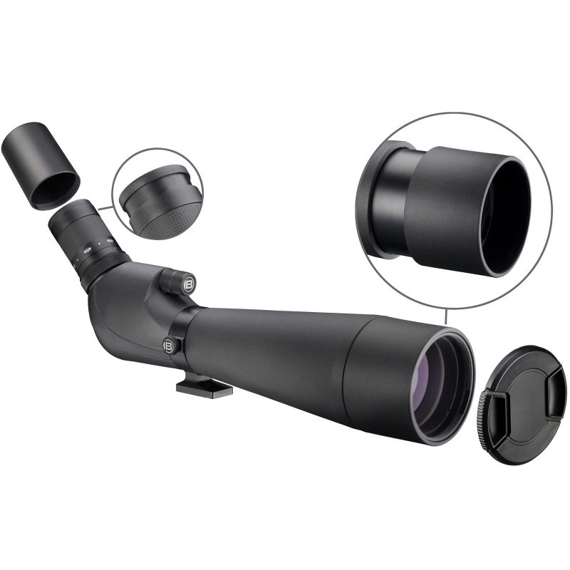 Фокусировка решена в виде маховичка небольшого диаметра, расположенного в центральном положении, что удобно для использования, независимо от того какой рукой проводить фокусировку. Для большего комфорта наблюдений применен поворотно-выдвижной наглазник. Выдвижная бленда обеспечивает надежную защиту и от солнечных бликов и от осадков. Крышки объектива и окуляра надежно фиксируются на своих местах и точно не потеряются во время движения.