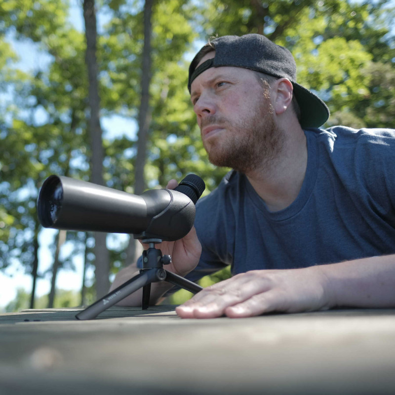 Tripod mountable. В редких случаях подзорные трубы используются для наблюдения без штатива. Как правило это трубы с прямым окулярным узлом. Большие увеличения, длительные наблюдения, съемка на камеру или смартфон с помощью трубы, а в особенности окулярный узел под углом 45º, требуют стабильного положения трубы. Данная модель имеет хомут с креплением на штатив со стандартной резьбой 1/4 - 20 UNC. Возможно использование штативов без быстросъемной планки.
