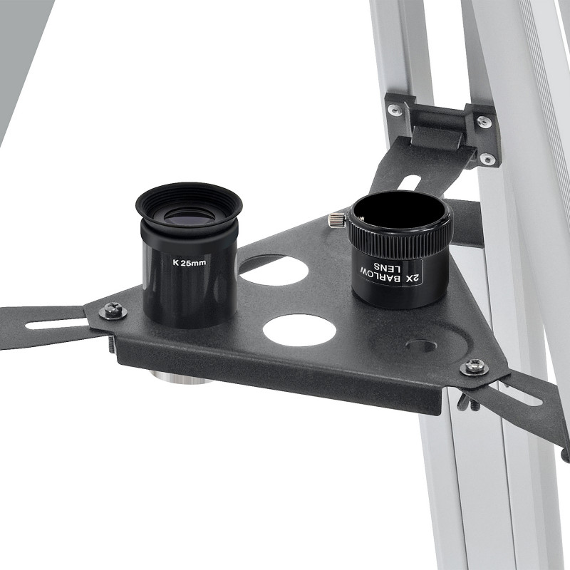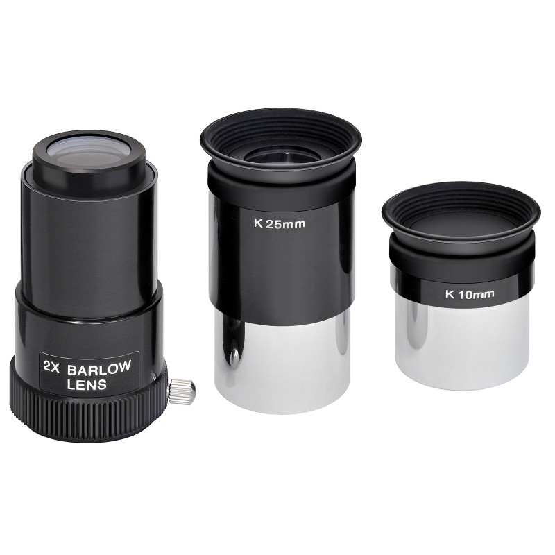 Телескоп оснащен фокусером с посадочным диаметром под окуляры 2” (для использования окуляров стандарта 1,25” в комплекте имеется переходник). Это позволяет использовать широкоугольные окуляры, чтобы получить большое поле зрения при наблюдениях протяженных объектов и звездных полей. Два окуляра в сочетании с линзой Барлоу дают минимальную но достаточную вариативность увеличений. Телескоп оснащен точечным искателем Red Dot. Для большего удобства наблюдений (особенно ландшафтных) в комплект входит диагональное зеркало.