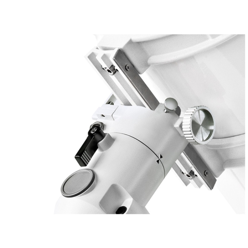 Телескоп комплектуется немецкой экваториальной монтировкой EXOS-1 и устойчивой стальной треногой. Дополнительную жесткость треноге придает металлическая полочка для принадлежностей, имеющая отверстия под окуляры стандартов 1.25” и 2”. Высота треноги регулируется, что позволяет адаптировать телескоп к росту наблюдателя. Монтировка EXOS-1/EQ4 имеет понятную конструкцию и систему управления и способна нести трубу весом до 7 кг. Механизмы тонких движений по обеим осям снабжены гибкими удобными ручками для комфортного управления телескопом при любом положении наблюдателя. Монтировка может быть дополнена приобретаемыми отдельно электрическим приводом оси прямого восхождения и искателем полюса для сопровождения суточного движения светил без участия наблюдателя при визуальных наблюдениях или фотосъемке.