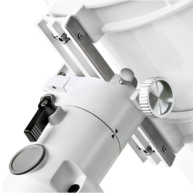 Телескоп комплектуется немецкой экваториальной монтировкой EXOS-2 и устойчивой стальной треногой. Дополнительную жесткость треноге придает металлическая полочка для принадлежностей, имеющая отверстия под окуляры стандартов 1.25” и 2”. Высота треноги регулируется, что позволяет адаптировать телескоп к росту наблюдателя. Монтировка EXOS-2/EQ5 имеет понятную конструкцию и систему управления и способна нести трубу весом до 13 кг. Механизмы тонких движений по обеим осям снабжены гибкими удобными ручками для комфортного управления телескопом при любом положении наблюдателя. Монтировка может быть дополнена приобретаемыми отдельно электрическим приводом оси прямого восхождения и искателем полюса для сопровождения суточного движения светил без участия наблюдателя при визуальных наблюдениях или фотосъемке. Одной из последних доработок компании, внедренных в данном телескопе, является новый фокусер Hexafoc с внутренним диаметром 2,5". Благодаря такому решению, удалось избежать возможного виньетирования (обрезания) изображения при работе с широкопольными двухдюймовыми окулярами. Кроме того внимание было уделено улучшению плавности хода и стабильности самой системы фокусировки.