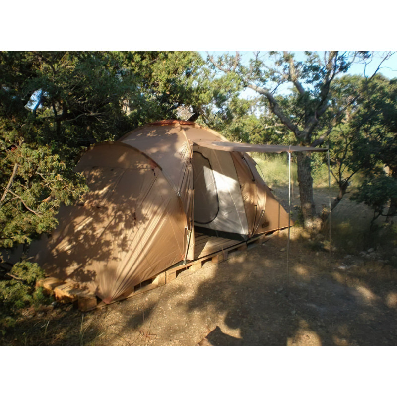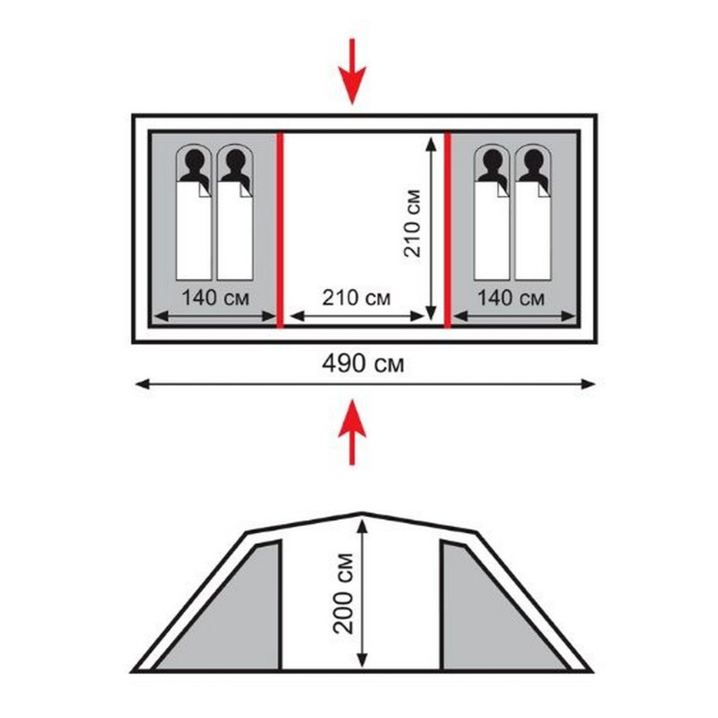- Двокімнатна компанівка намету, кожен з двох житлових відсіків розмірами 2,20 на 1,40 м і висотою до 1,65 метра