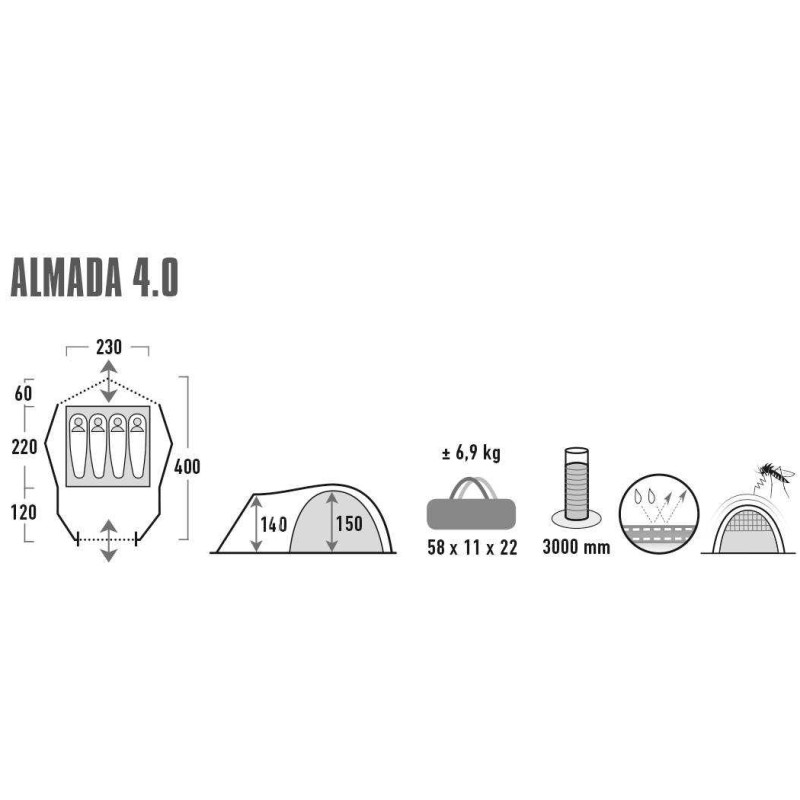 Палатка премиум-класса High Peak Almada 4.0 с инновационной системой вентиляции, создана для комфортного размещения 4-х человек. Наличие двух регулируемых систем вентиляции Adanced Low Vent и Vario Vent Control способствуют созданию в палатке максимально комфортного микроклимата при любых погодных условиях. Использование новых высококачественных материалов позволило повысить степень защиты отдыхающего от вредоносного воздействия ультрафиолетовых лучей в соответствии с стандартом - UV STANDARD 801. Внутренняя часть тента имеет специальное алюминизированное покрытие, которое обеспечивает дополнительную термоизоляцию. Антимоскитные сетки расположены на входах в палатку, а также на входе в спальную комнату. Просторная затемненная спальня дает возможность отдохнуть не только ночью, но и днем. Прозрачные окна со шторами. Два раздельных тамбура для размещения туристического инвентаря. Палатка High Peak Almada 4.0 станет хорошим выбором для использования, как в базовом лагере, так и для семейного отдыха на природе.