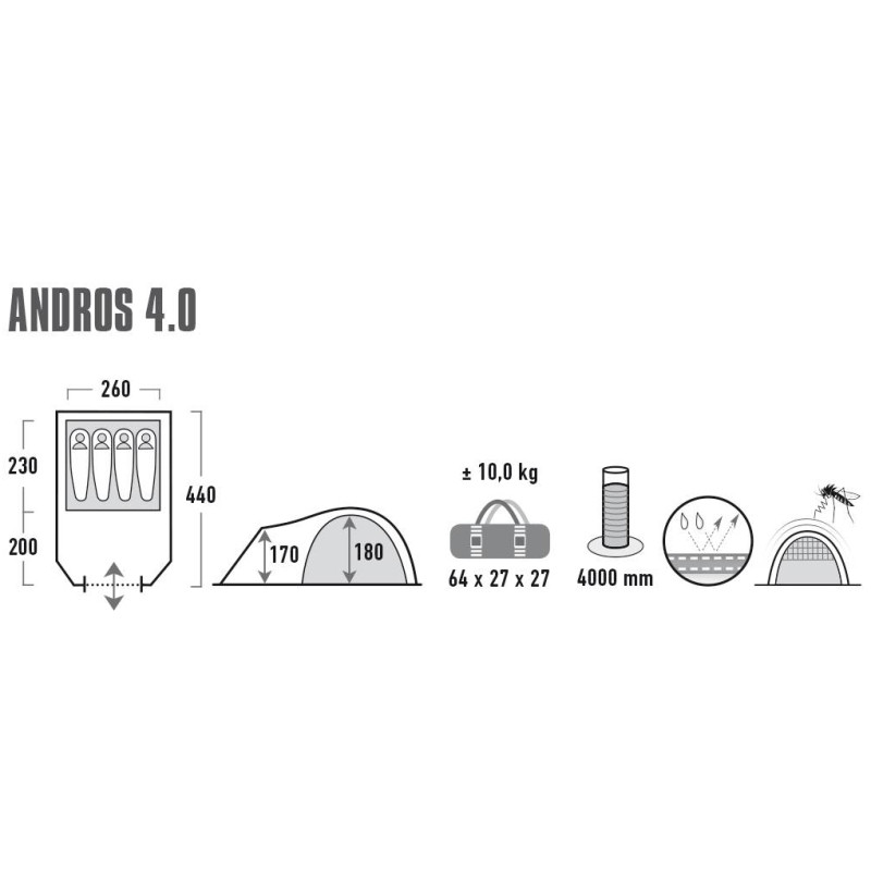 Кемпинговая палатка High Peak Andros 4.0 оборудована двумя регулируемыми системами вентиляции Dual Flow Vent System и Vario Vent Control. Данные системы позволяют создать в палатке максимально комфортный микроклимат при любых погодных условиях. Затемненная спальня способствует комфортному отдыху не только ночью, но и в дневное время суток. Просторный тамбур позволяет легко разместить туристический инвентарь или организовать кемпинговую кухню. Прозрачные окна со шторами, антимоскитные сетки на входе в палатку и в спальный отдел, проклеенные швы, водозащита от дождя в 4000 мм и многое другое позволят использовать палатку полноценно как в базовом лагере, так и для семейного отдыха на природе.