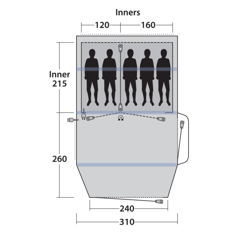 - Outwell HookTrack System - возможность устанавливать специальные фиксаторы для прокладки электрокабеля и крепления легких аксессуаров, например лампы весом до 1,5 кг.