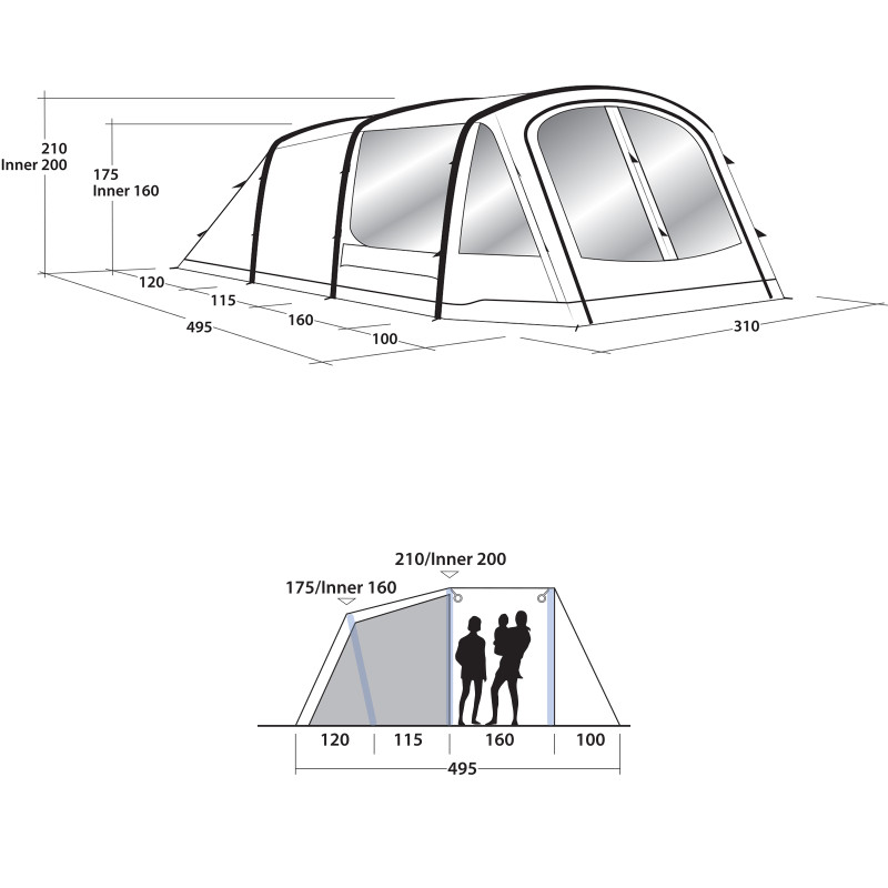 - Outwell Wind Brace System - использование фиксирующих лямок в ключевых точках вдоль надувных балок, чтобы обеспечить повышенную устойчивость палатки при сильном ветре.