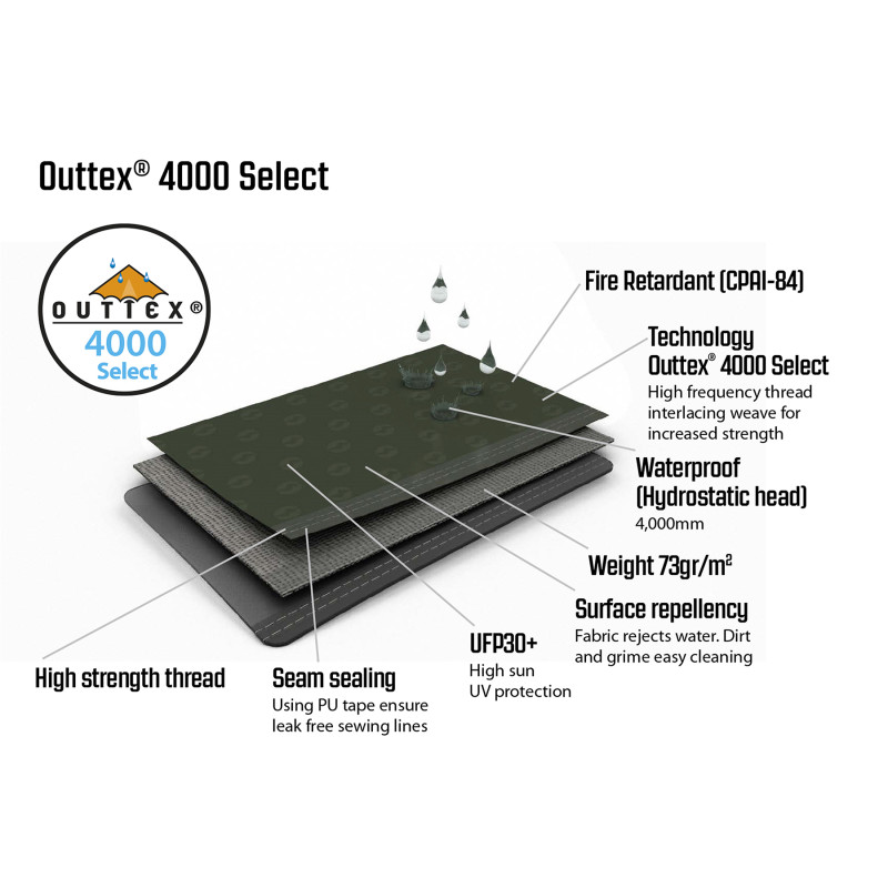 - Outtex® 4000 Select - износостойкий, качественный, 100% полиэстер, отвечающий основным требованиям, предъявляемым к тканям, идеальным для обычного кемпинга. Он огнестойкий, имеет полиуретановое покрытие, которое обеспечивает водонепроницаемость 4000 мм вод. ст.