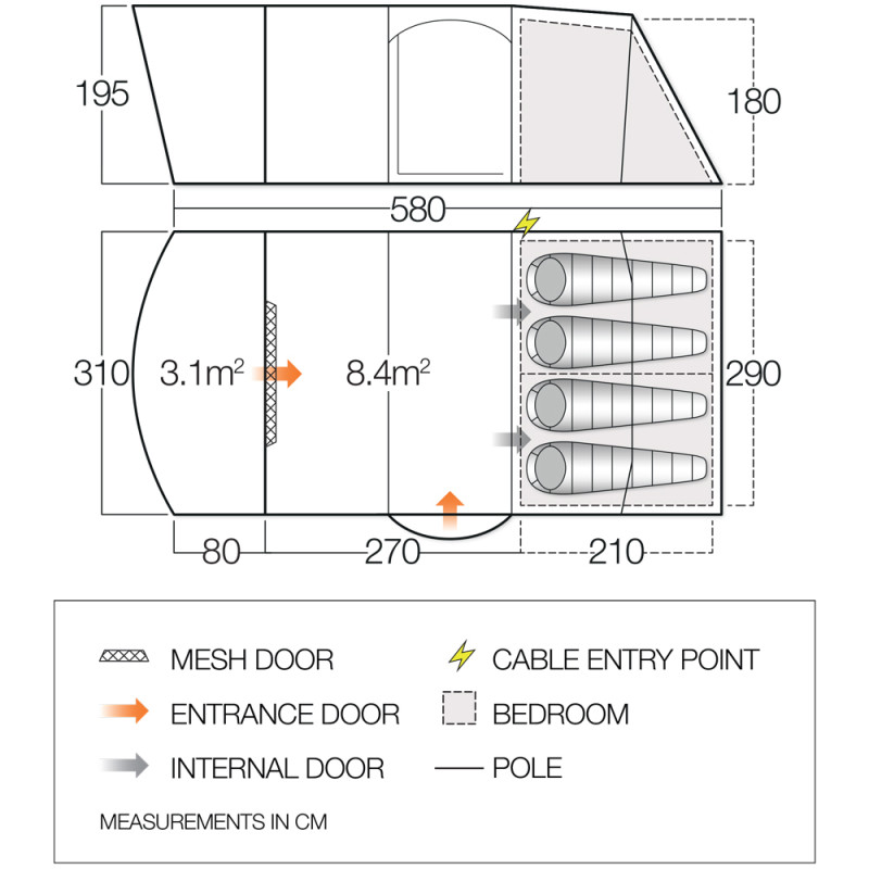 - Внешняя палатка (Д х Ш х В): 580 х 310 х 195 см