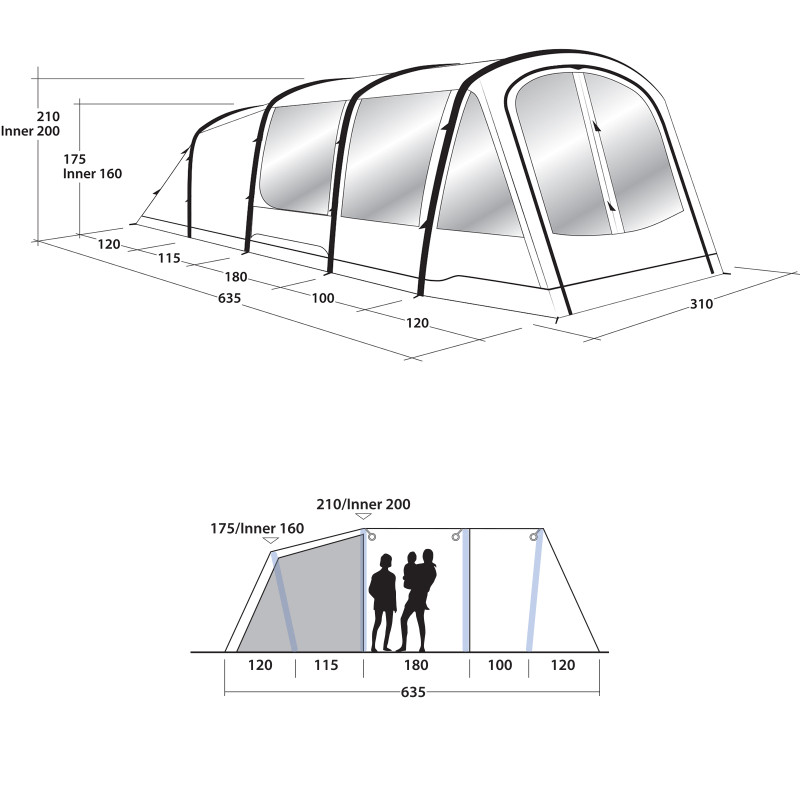 - Outwell Wind Brace System - использование фиксирующих лямок в ключевых точках вдоль надувных балок, чтобы обеспечить повышенную устойчивость палатки при сильном ветре.