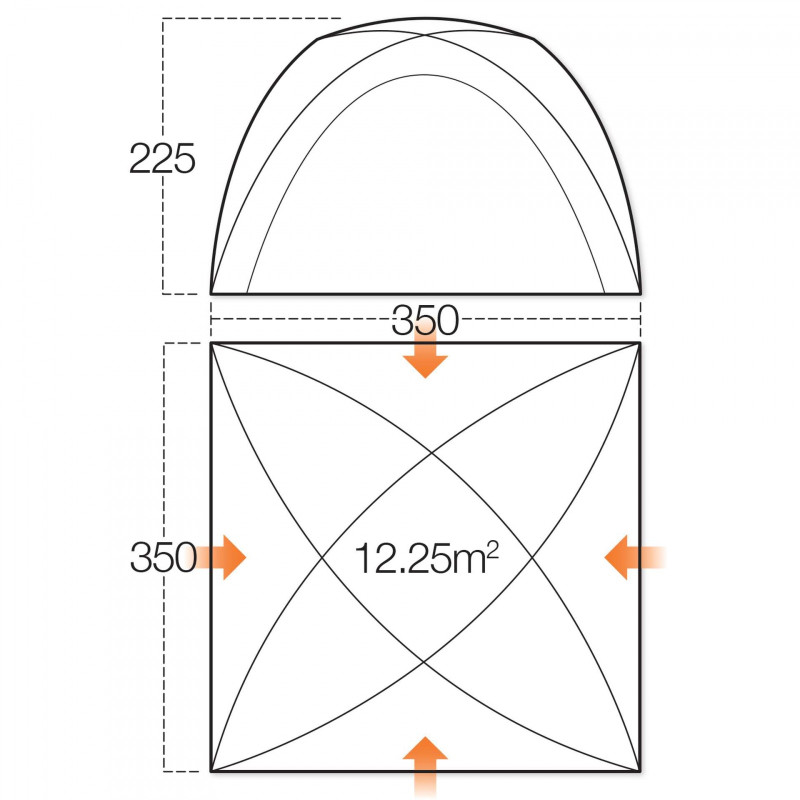 - Внешняя палатка (Д х Ш х В): 350 х 350 х 225 см