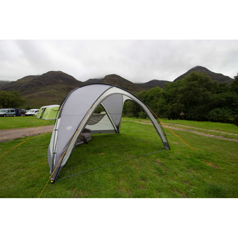 Vango Hogan Hub Cloud Grey - среднеразмерный кемпинговый шатер-павильон, в котором можно укрыться от солнца или дождя, организовать общение с друзьями, активные игры с детьми или просто отдохнуть. Все четыре двери на молнии, чтобы защитить отдыхающих от непогоды. Стоит отметить, что тент палатки имеет значительную степень водонепроницаемости, а свободностоящий каркас состоит из несущих дуг, имеющих четыре точки пересечения, обладает высокой жесткостью конструкции, противостоящую ветровым нагрузкам. Тент изготовлен из ткани Sentinel Active, которая разработана для обеспечения отличного качества и минимального веса. В ткань вплетена полиэфирная нить, которая на 97% защищает внутреннее пространство от УФ-лучей солнца. Кроме того, палатка имеет достаточно высокий уровень водозащиты. Данная модель палатки прошла испытания на безопасность согласно Международного стандарта ISO5912.