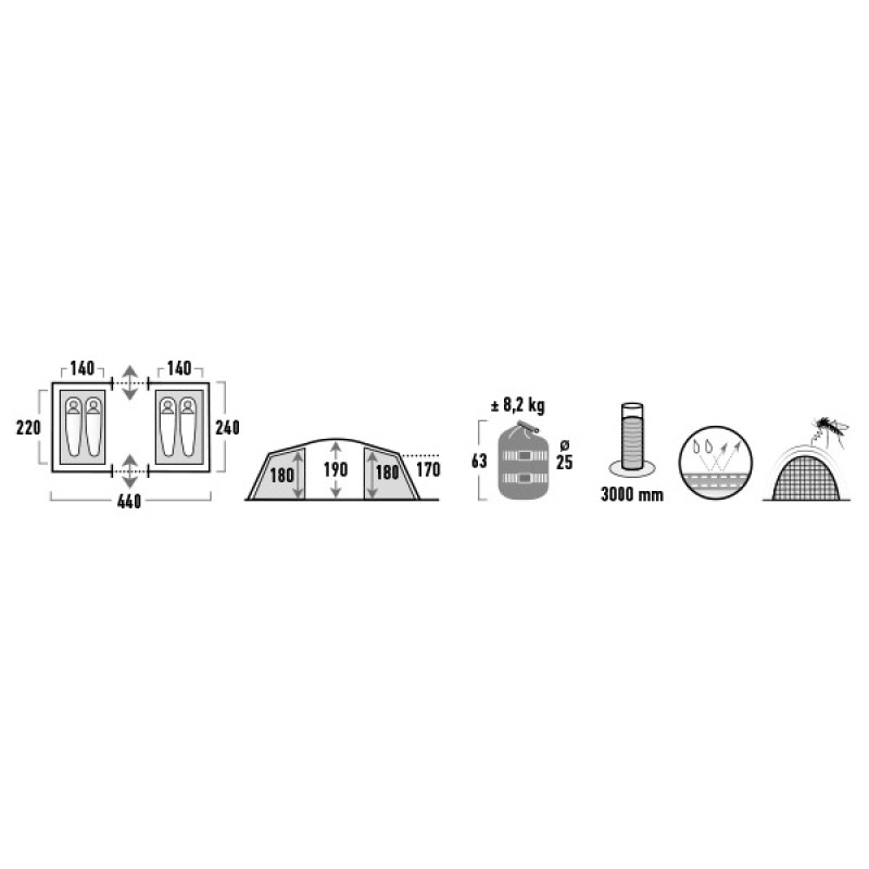 High Peak Goose 4 LW Pesto/Red (10333) - легкая четырехместная туннельная палатка с алюминиевым каркасом, весит всего 8,2 кг и поражает небольшим размером упаковки. Гибкие и крепкие дуги изготовлены из высококачественного алюминиевого сплава 7001 Т6, гарантируя высокую устойчивость к ветровым нагрузкам. Сверхлегкие и крепкие алюминиевые колышки надежно закрепляют палатку к земле. Наружный тент водостойкостью 3000 мм вод. ст. изготовлен из высококачественного полиэстера с полиуретановым покрытием и имеет водонепроницаемые швы. В гостиную есть два входа с большим сетчатым окном для лучшей вентиляции и отдельным съемным полом. На противоположных концах палатки расположены две большие постоянные вентиляционные системы Advanced Low Vent System для оптимального проветривания внутреннего пространства. Advanced Low Vent System - высокоэффективная система вентиляции на уровне земли, которая обеспечивает циркуляцию воздуха по всей площади пола с обеих сторон даже в дождливые дни. Дополнительное пространство между внешним тентом и внутренней палаткой минимизирует образование конденсата. Advanced Low Vent System легко регулируется с помощью молний изнутри внутренних палаток. Две отдельные внутренние палатки оснащены дверями с москитными сетками, полезными органайзерами, внутренними карманами и двумя креплениями для фонарей. Цветовая маркировка точек крепления внутренней палатки к внешнему тенту способствует легкой установке палатки. High Peak Goose 4 LW Pesto/Red (10333) предлагает достаточно места для 4-х человек, идеально подходит для активного семейного кемпинга и походов с друзьями.