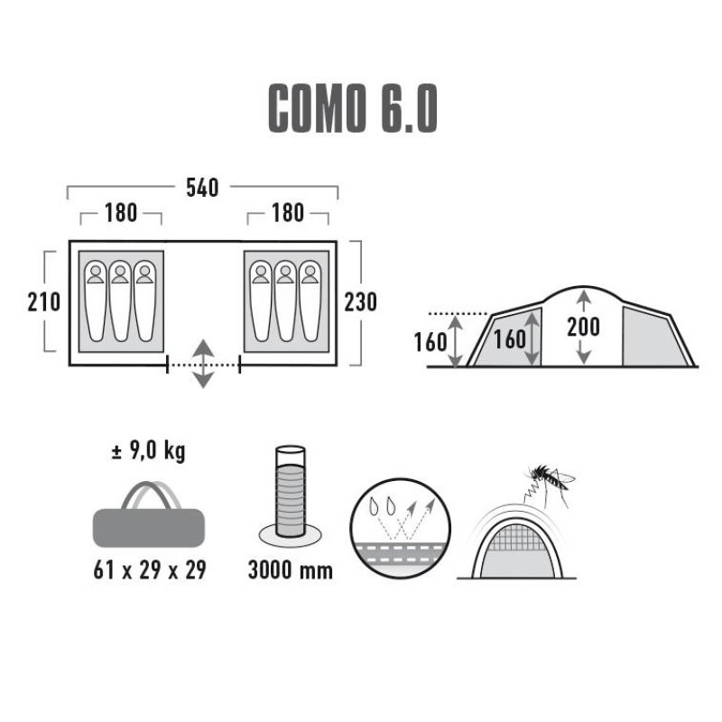 Обновленная модель кемпинговой палатки High Peak Como 6.0 станет надежным спутником в ваших путешествиях. Использование новых высококачественных материалов позволило повысить степень защиты отдыхающего от вредоносного воздействия ультрафиолетовых лучей в соответствии с стандартом - UV STANDARD 801. Внутренняя часть тента имеет специальное алюминизированное покрытие, которое обеспечивает дополнительную термоизоляцию. Эффективная система вентиляции VARIO VENT CONTROL на входах во внутренние палатки, обеспечивает комфортный микроклимат при любых погодных условиях. Две раздельные, затемненные спальни дают возможность отдохнуть не только ночью, но и в дневное время суток. Просторный тамбур позволяет легко разместить туристический инвентарь или организовать кемпинговую кухню. Антимоскитные сетки на входах в спальную комнату. Модель High Peak Como 6.0 станет хорошим выбором для использования, как в базовом лагере, так и для семейного отдыха на природе.