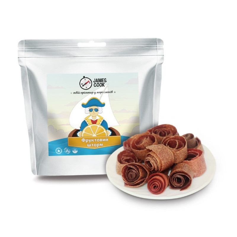 Пастила – натуральный продукт, приготовленный путем сушки фруктовых или овощных пюре. Фруктовая пастила James Cook отличное решение как для перекуса во время напряженного ходового дня так и в качестве десерта во время основных приемов пищи. Имеет оригинальный освежающий вкус и вносит приятное и яркое разнообразие в походный рацион. В походе или во время насыщенного рабочего дня, перед или после спортивной тренировки – фруктово-овощная пастила «Фруктовый Шторм» идеальный вариант для быстрого перекуса. Вкусная, калорийная, полезная, богатая витаминами и вообще не отнимет времени для приготовления. Подойдет как взрослым так и маленьким путешественникам. Не содержит красителей или консервантов. «Фруктовый Шторм» это микс из 4 вкусов : яблочно-банановый, морковно-яблочный, киви-банановый и яблочно-имбирный.