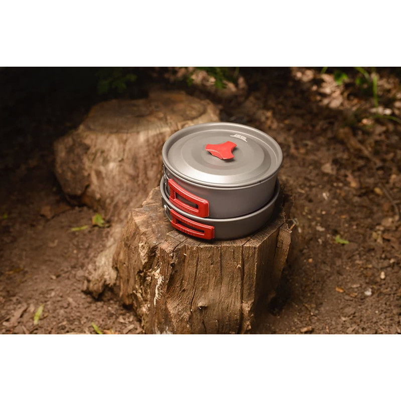 До складу виробів увійшов алюміній і вогнетривкий пластик, завдяки чому комплект вийшов міцним і захищеним від зовнішніх факторів. Металеві частини посуду виконані із застосуванням нержавіючої сталі, стійкої до абразивних впливів. Рукоять можна складати при необхідності. Крім того, ємності забезпечені антипригарним покриттям, що, звичайно, дуже практично. Посуд має міцні кришки. Все продумано до дрібниць, щоб приготування їжі на природі не було пов'язане ні з якими труднощами.