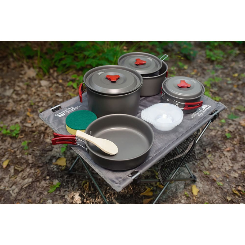Набір посуду включає в себе чотири ємності, ополоник, ложку, губку для миття посуду. Є також чохол для зберігання і перенесення виробів. Дуже зручний комплект для туристичних цілей. Сюди увійшли: дві каструльки, казанок, а також сковорідка. Всі ці предмети можуть бути компактно складені один в один, і не будуть займати багато місця в рюкзаку. Комплект допоможе зробити процес кулінарії на природі більш простим і швидким. Рукояті посуду можуть запросто складатися, що сприяє ще більшій зручності. Комплект відмінно адаптований для експлуатації в польових умовах.