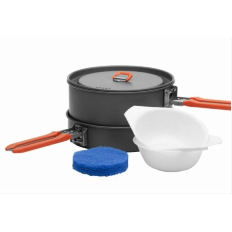 Набір портативної посуду FEAST 1 - найменший з всього посуду серії FEAST. Він розрахований на 1-2 чоловік. Притому, що набір дуже компактний і легкий, вирішена головна задача - це зручність в експлуатації. Нова повноцінна ручка з фіксатором дозволяє зручно тримати посуд при готуванні, а при натисканні кнопки фіксатора дозволяє скласти ручку і зібрати набір в компактний вигляд для економії місця при зберіганні і транспортування. Ручка виконана з приємного на дотик теплоізолюючого матеріалу.