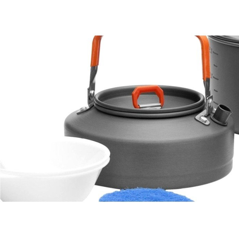 Набір портативної посуду FEAST 2 з чайником, що дозволяє поєднати в собі приготування їжі та напоїв і замінити собою цілу похідну кухню. Набір розрахований на 2-3 чоловік. Притому, що набір дуже компактний і легкий, вирішена головна задача - це зручність в експлуатації. Нова повноцінна ручка з фіксатором дозволяє зручно тримати посуд при готуванні, а при натисканні кнопки фіксатора дозволяє скласти ручку і зібрати набір в компактний вигляд для економії місця при зберіганні і транспортування. Ручка виконана з приємного на дотик теплоізолюючого матеріалу.