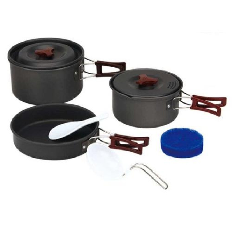 Туристичний набір посуду на 2-3 персони. Складається з двох казанків з кришками, миски-сковорідки, трьох пластикових чашок і двох ложок. Складається за принципом матрьошки.