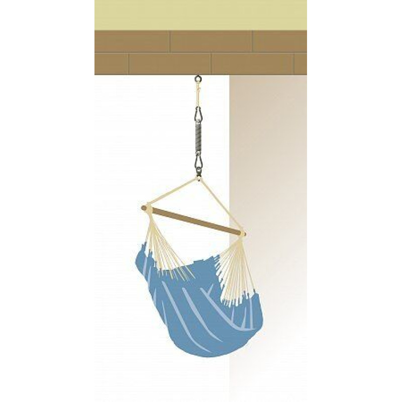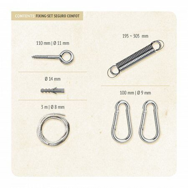 Крепления для подвесных стульев La Siesta Seguro Confort AS-05 для крепления за дерево, балку или потолок. Seguro состоит из кольца крючок с Фишером дюбелей, веревки с трех метров в длину и карабином. TÜV Rheinland-сертифицирован и проверен на грузоподъемность 160 кг.