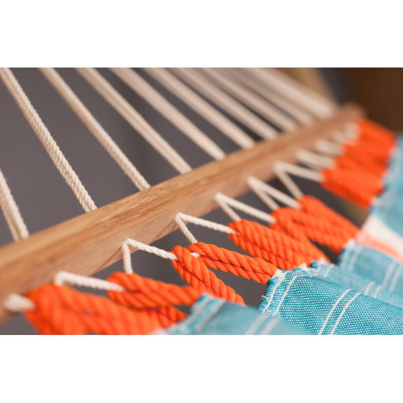 Надежное крепление к стойкам обеспечивается прочными крепкими канатами, которые равномерно распределяются всей ширине сукна. Главным преимуществом данной модели является наличие бамбуковой планки, которая расправляет и удерживает сукно по всей ширине. Прочный бамбук, имеет гладкую поверхность, которая не портится под воздействием атмосферных явлений. К тому же, гамак очень легко крепится в стойкам с помощью специальных петель. И даже, если расстояние между петлями слишком большой, в всегда можете удлинить гамак с помощью специального каната.