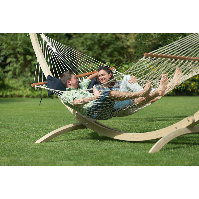 Гамак семейный с рейками La Siesta California выполнен в североамериканском традиционном стиле. Перекладины созданы из прочной древесины, изготовляемой из сосны пинии, проходящей несколько этапов обработки. Сетка, из которой выполнено место для лежания — мягкая, не вдавливается в кожу. Гамак оснащен съемной подушкой для более комфортного отдыха. Модель характеризуется правильным распределением веса за счет большого количества шнуров, соединяющих лежак и планку.